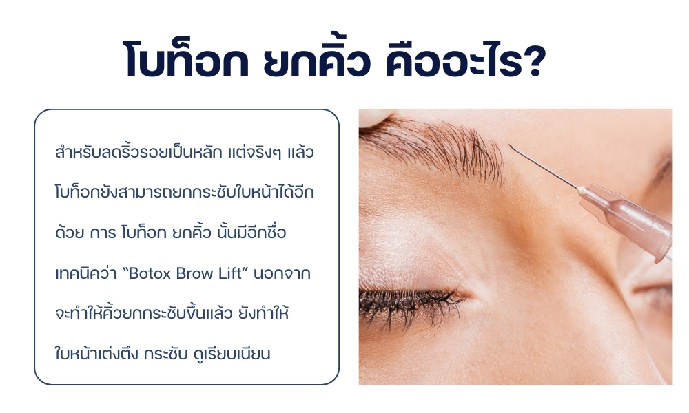เป็นชื่อจริงของการ โบท็อก ยกคิ้ว โดยจะฉีดโบท็อกไปที่บริเวณโหนกคิ้ว เพื่อให้โบท็อกเข้าไป ทำหน้าที่ผ่อนคลายคลายกล้ามเนื้อที่ดึงหนังตาให้ตกลง และทำให้กล้ามเนื้อมัดที่ดึงขึ้นทำงานได้อย่างเต็มประสิทธิภาพมากยิ่งขึ้น ทำให้คิ้วยกขึ้นกว่าเดิมและเปิดตาขึ้น ซึ่งเป็นหัตถการที่ได้รับความนิยมเพราะ มีขั้นตอนที่ง่าย ใช้เวลาไม่นาน ไม่เจ็บตัว และไม่ต้องพักฟื้น